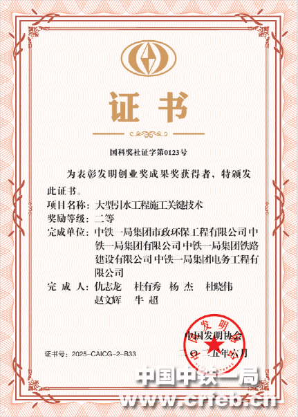 近日,中國發明協會發布了2025年度發明創業獎人物獎、成果獎、創新獎的評審結果,中鐵一局市政環保公司主持完成的《大型引水工程施工關鍵技術》科研成果榮獲中國發明協會發明創業獎成果獎二等獎。
